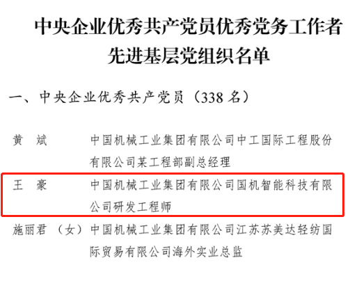 王豪榮獲國(guó)務(wù)院國(guó)資委黨委表彰的“中央企業(yè)優(yōu)秀共產(chǎn)黨員”稱號(hào)。