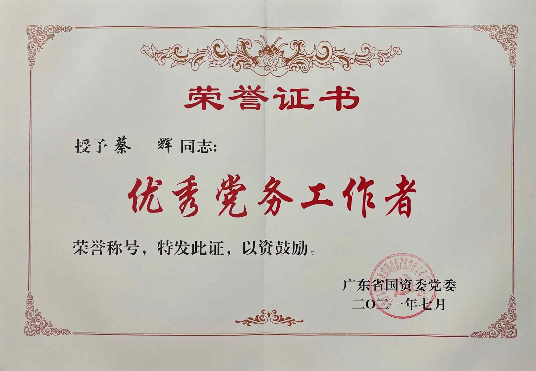 蔡輝榮獲廣東省國(guó)資委黨委表彰的“廣東省國(guó)資系統(tǒng)優(yōu)秀黨務(wù)工作者”稱號(hào)。